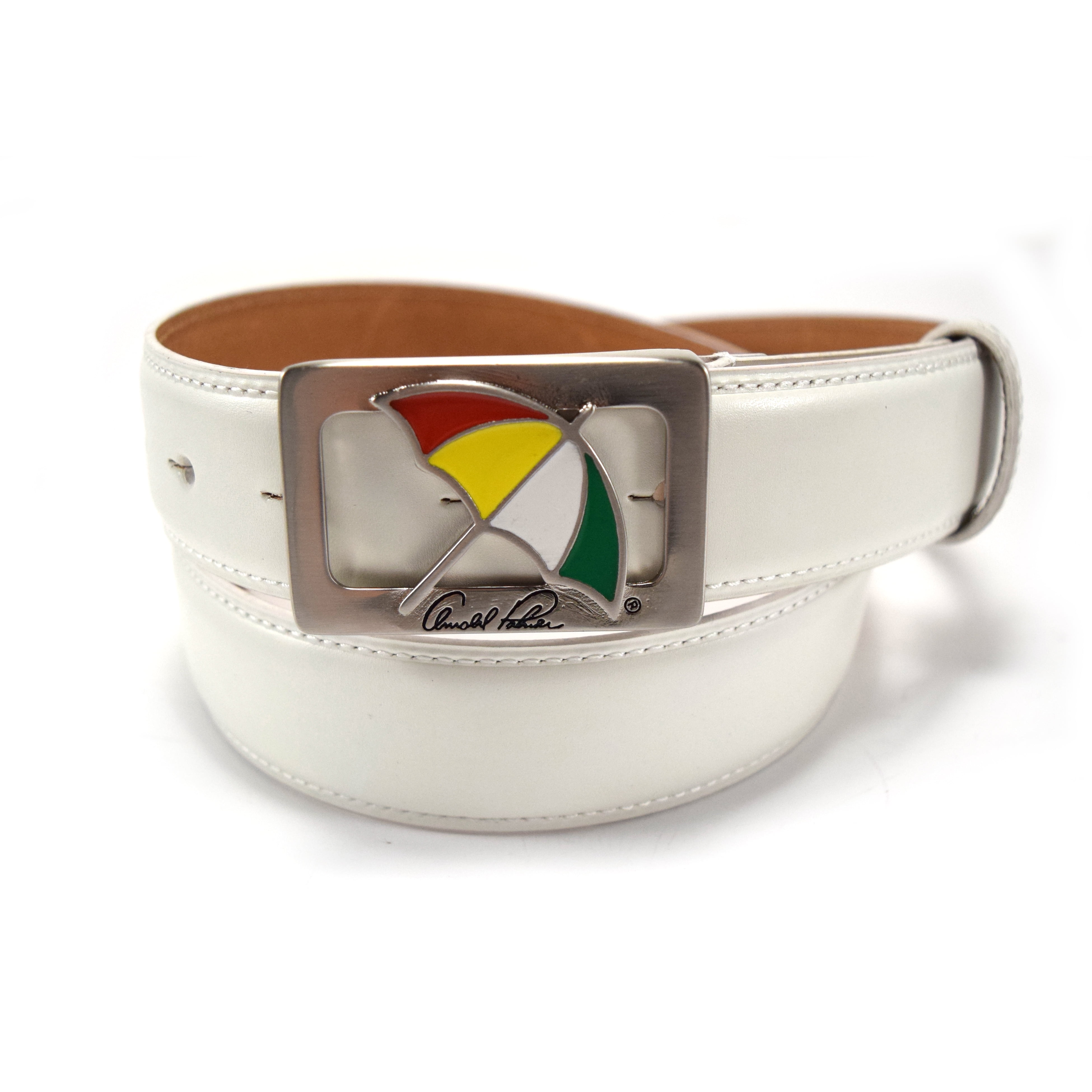 Arnold Palmer White Embossed Strap Umbrella Logo Belt by Arnie Belts from cdn11.bigcommerce.com